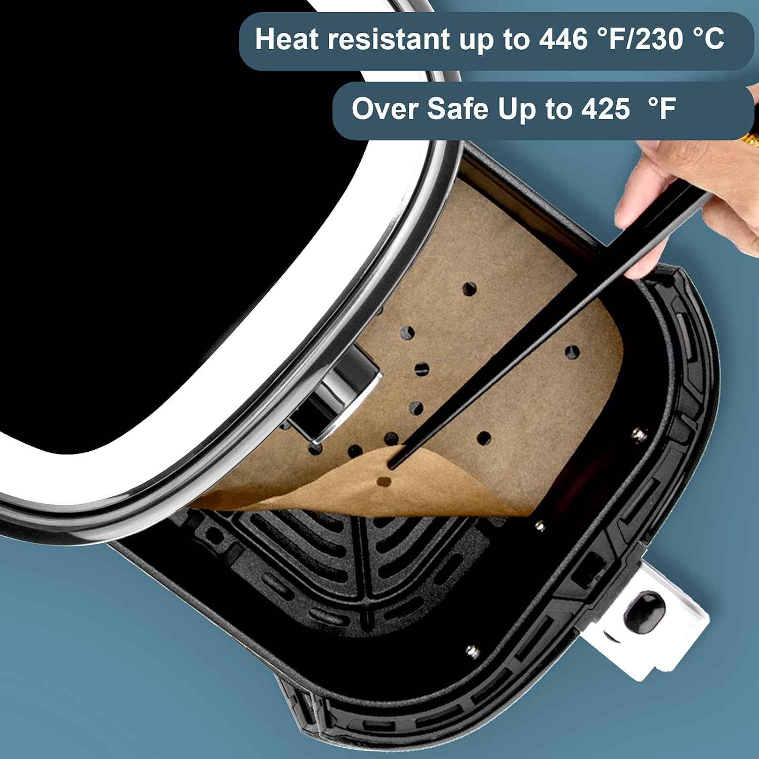 • 【Heat Resistanceh】Our air fryer parchment paper liners/air fryer liners heat safe up to 446℉ (230℃), make your air fryer liner intact during cooking. WARNING: Do Not put the air fryer parchment paper in the basket and preheat your air fryer without food on top! The food should at least cover the 2/3 the area of the parchment.