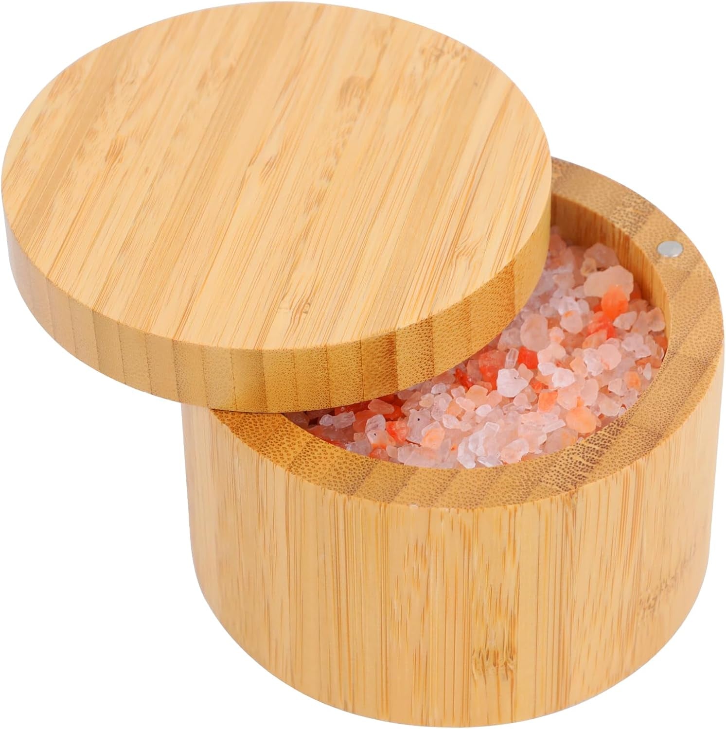 • 100% NATURAL MATERIAL: Crafted from premium bamboo, this round salt box exudes simplicity and warmth, making it an attractive and practical addition to your kitchen countertop.