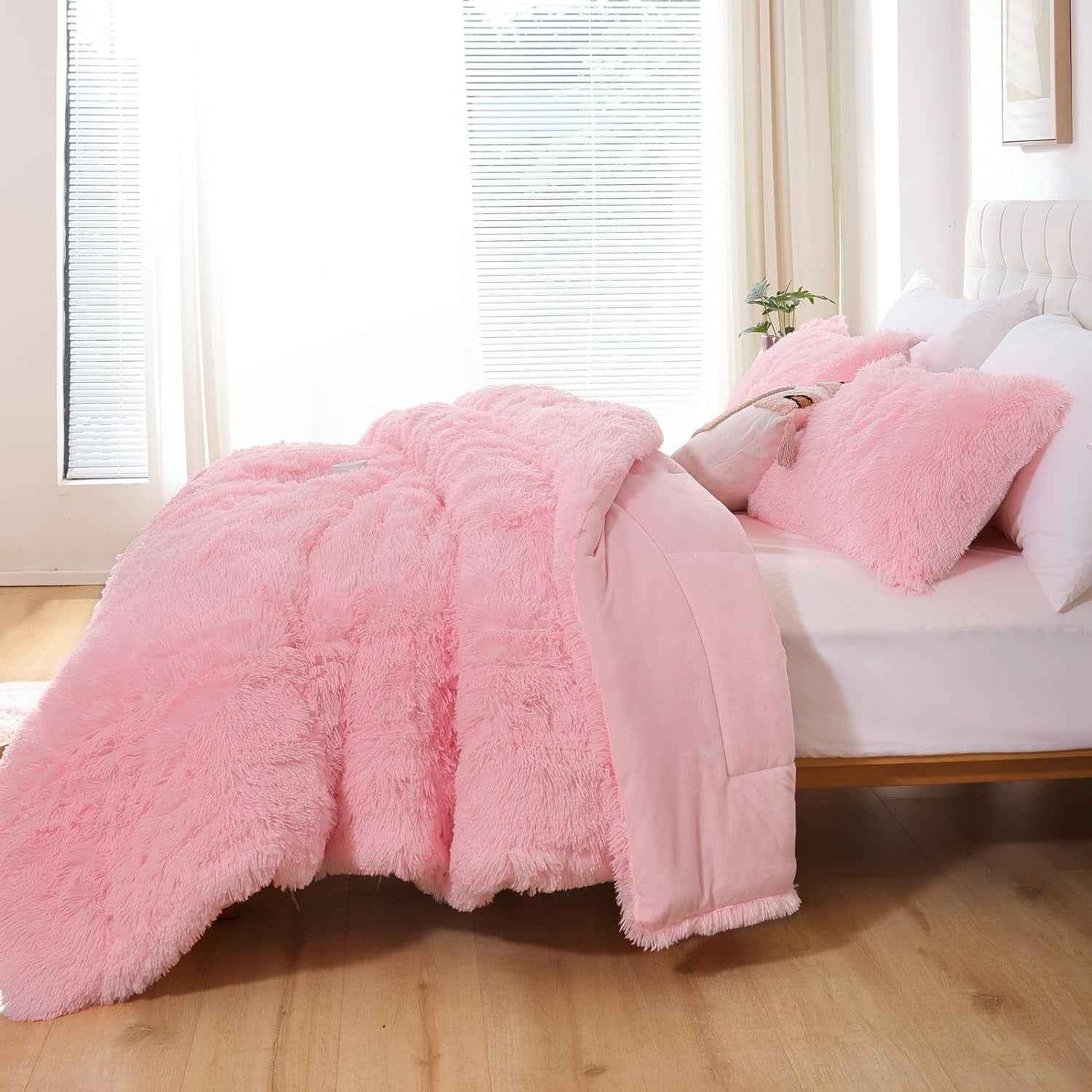 • WARM AND COMFORT: fluffy comforter set queen make you warm and cozy during the cold weather. Meanwhile, this queen plush bed set is light enough that you don't overheat. Baby pink faux fur bedding set offers warmth, comfort, and chic contemporary update to any dormitory, bedroom.