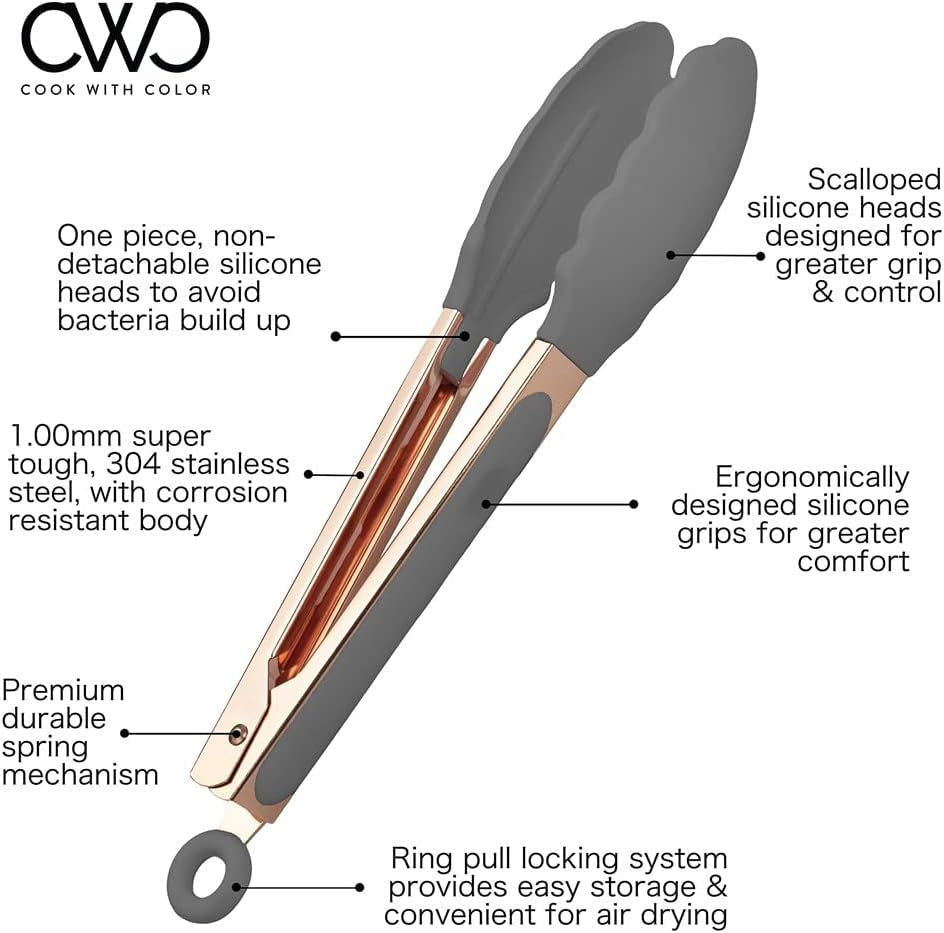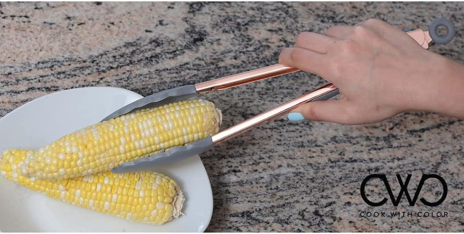 Stylish Stainless Steel Silicone Tipped Tongs Set - 9” & 12” - Perfect for Non-Stick Cookware, BBQ & Cooking - BPA Free, Sturdy, Locking Design in Rose Gold & Gray